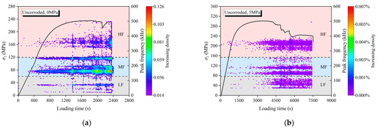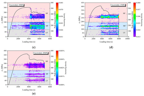 AE frequency domain characteristics can be used to analyze the fracture process and to identify fracture precursor information of rocks [44,45]. The evolution characteristics of the peak frequency distribution of granite specimens under different chemical corrosion conditions are shown in Figure 14, Figure 15 and Figure 16. According to the magnitude of the peak frequency, it is divided into three frequency ranges: high frequency (HF, >256 kHz), medium frequency (MF, 128~256 kHz), and low frequency (LF, <128 kHz). The peak frequency of the uncorroded specimen is mainly concentrated in the MF, and the HF signal gradually increases with the increase in confining pressure. Moreover, a large number of AE frequency signals are generated when a stress drop occurs, with the density of the frequency distribution increasing significantly. Acid- and alkali-corroded specimens have lower peak frequency densities than uncorroded specimens and relatively fewer AE frequency signals before a stress drop occurs. After the first stress drop, a large amount of AE frequency signals are still released, although a high-density frequency distribution is rarely observed. In summary, when the rock enters the unstable fracture stage, both uncorroded and corroded specimens show a large number of AE frequency signals, but corroded specimens may not necessarily exhibit high-density frequency distributions. Therefore, it is possible to determine whether the rock has reached the critical fracture state by monitoring the changes in the number of AE peak frequency signals.