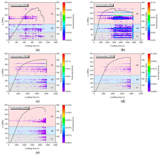 AE frequency domain characteristics of acid-corroded granite specimens under different confining pressures. (a) 0 MPa; (b) 5 MPa; (c) 10 MPa; (d) 15 MPa; (e) 20 MPa.