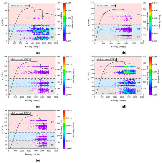 AE frequency domain characteristics of alkali-corroded granite specimens under different confining pressures. (a) 0 MPa; (b) 5 MPa; (c) 10 MPa; (d) 15 MPa; (e) 20 MPa.