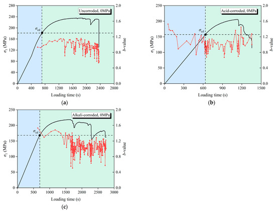Evolution of AE b-values with different loading times under unconfined compression. (a) Uncorroded; (b) Acid-corroded; (c) Alkali-corroded.