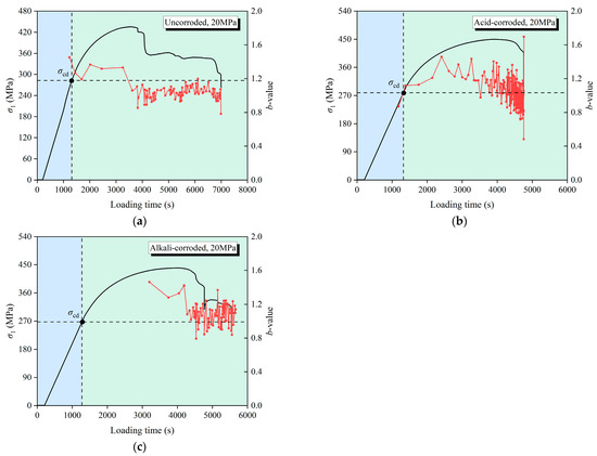 Evolution of AE b-values with different loading times under confining pressure. (a) Uncorroded; (b) Acid-corroded; (c) Alkali-corroded.
