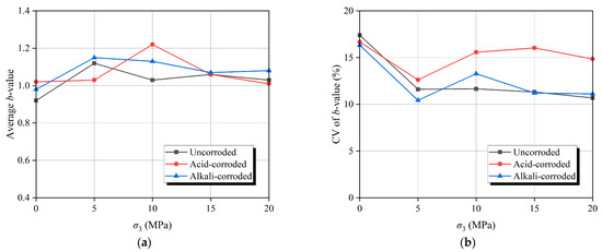 Variations in average values and CV of b-values with confining pressure. (a) Average b-value; (b) CV of b-value.