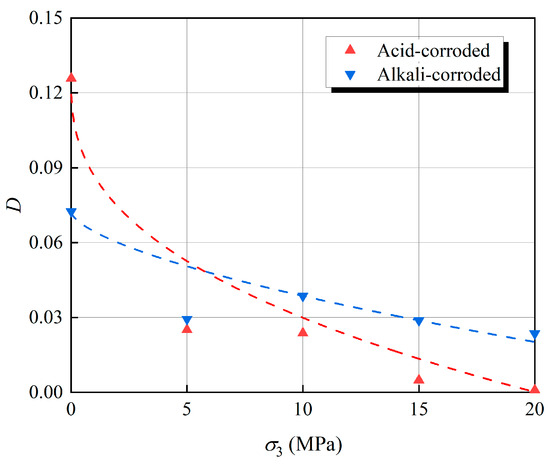 The variation in chemical damage variables of chemically corroded granite specimens with confining pressure is shown in Figure 20. It can be observed that the chemical damage variable decreases nonlinearly with the increase in confining pressure, and its quantitative relationship can be established using nonlinear fitting equations. The fitting equations are as follows: