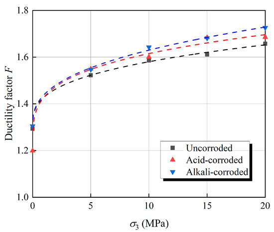 Under unconfined conditions, the elastic modulus of acid-corroded and alkali-corroded specimens decreases to varying degrees. The order of elastic modulus from highest to lowest is uncorroded > alkali-corroded > acid-corroded specimens. This indicates that chemical corrosion has a weakening effect on the elasticity of granite specimens. Under the application of confining pressure, the elastic moduli of the acid-corroded and alkali-corroded specimens approximate that of the uncorroded specimens. This suggests that confining pressure can suppress the weakening effect of chemical corrosion on elasticity, enhancing its ability to undergo elastic deformation. The elastic modulus of the uncorroded specimens shows an approximately linear increase with confining pressure, while the acid-corroded and alkali-corroded specimens exhibit a rapid increase within the range of 0–5 MPa confining pressure, followed by an approximately linear growth with increasing confining pressure. Nonlinear fitting was performed on the experimental data to obtain the fitting relationship between the elastic modulus and confining pressure as follows: