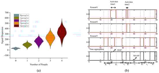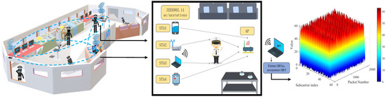 where is the carrier wavelength, represents the product of the and antenna gains and the reflection coefficient of S, and is the path loss exponent. This expression reveals how the signal strength varies with the distances between AP and S and between S and STA. The working principle of person perception based on Wi-Fi is based on the change in channel gain due to physical motion. The motion of the human subject S leads to changes in and , which in turn leads to changes in the channel gain over time. By analyzing the time series of obtained from the channel state information of the Wi-Fi frames, the AP and STA can sense the motion of S.