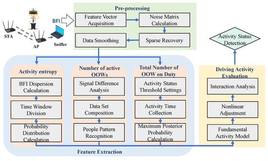 The proposed methodology consists of data collection, feature extraction, activity detection, and activity level evaluation. Wi-Fi BFI data are collected from multiple access points strategically placed within the ship bridge. The BFI data capture the physical and directional properties of the Wi-Fi signals, which are influenced by the movements and activities of the OOWs. The collected BFI data are processed to extract relevant features such as the signal strength, angle of arrival, and movement patterns. These features are critical for identifying and distinguishing different types of activities performed by the OOWs. Machine learning algorithms are employed to analyze the extracted features and detect specific activities. The algorithms are trained to recognize patterns associated with various OOW activities, ensuring accurate identification even in dynamic environments. The detected activities are further analyzed to evaluate the overall activity level of the OOWs. Indices such as the number of active individuals, action entropy, and activity time are used to provide a comprehensive assessment of OOW performance. This evaluation helps in identifying periods of inactivity or low engagement which could indicate potential safety risks.