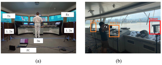 (1) Scenario Setting. To evaluate the performance of the proposed method in depth, this study constructed and tested two different experimental scenarios. First, a closed-space six-degrees-of-freedom ship driving simulation platform with a size of 2.62 m × 3.34 m was used to conduct a comprehensive system performance evaluation (referred to as test platform 1). Second, a “Golden Six” cruise ship cab that actually sailed on the Chongqing to Yichang route in China was selected as the second test platform. The size of the bridge used for actual system data collection and performance testing (referred to as test platform 2) was 12.85 m × 4.85 m, with the specific situation shown in Figure 7. In these two test scenarios, Tx and Rx respectively indicate the specific locations of the transmitter and receiver antennas of the Wi-Fi device.
