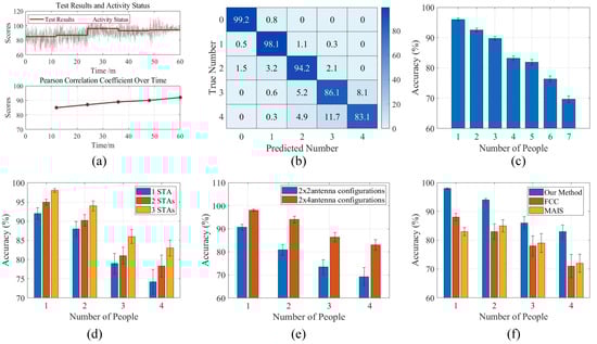 Different Antenna Configurations. Different antenna types significantly influence the outcomes of activity detection due to inherent disparities in their reception sensitivity, signal coverage area, and signal stability. This paper provides a detailed analysis of the application effects of 2 × 2 and 2 × 4 antenna configurations, which care both commonly used in activity detection systems. As depicted in Figure 8e, the detection results using the 2 × 4 antenna combination are markedly superior to those using the 2 × 2 combination. This improvement is attributed to the data transmission protocols, which allow for the extraction of four azimuth angles in the 2 × 2 configuration and ten azimuth angles in the 2 × 4 configuration, thereby increasing both the volume of data and the accuracy of detection.
