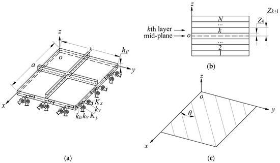 In this paper, the composite stiffened plate is taken as the research object, establishing the theoretical model based on the FSDT and Timoshenko beam theory. The composite stiffened plate is composed of a × b × hp laminate panel and hs × bs laminate stiffener. A global coordinate system o-xyz is established based on the mid-plane xoy, and a local coordinate system o′-x′y′z′ is established based on the neutral axis o′x′, as shown in Figure 1 and Figure 2. up, vp and wp represent the displacements of the composite stiffened plate along the x-, y-, and z-axes, respectively, while and are the rotation around the y- and x-axes. θ is the angle between the kth ply direction and the x-axis. Zk+1 and Zk are the coordinates of the upper and lower surface of the kth ply along the z-axis. The artificial virtual springs uniformly distributed along each side of the composite stiffened plate simulate the boundary conditions. The stiffness values of the linear support springs (ku, kv, and kw) and the twist springs (Kx and Ky) are adjusted to simulate various boundary conditions.