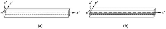 where Nx, Ny, and Nxy represent the in-plane force vectors. Mx, My, and Mxy represent the bending moment vectors. Qx and Qy represent the shear force vectors. κ = 5/6. Substituting Equation (7) into Equations (11)–(13), the relationship between the internal forces and strain components of the laminate panel is