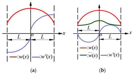 When the derivative of the displacement function represented by the traditional Fourier series is an odd function, discontinuities or jumps will occur at the end-point of the interval [−L, L], as shown in Figure 3a. The improved Fourier series method introduces auxiliary functions to the traditional Fourier series to avoid the phenomenon of discontinuities or jumps and to improve the poor convergence of the series [60].