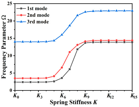Figure 4 illustrates the first three dimensionless frequency parameters of the composite stiffened plate for varying spring stiffness K. The geometrical and material parameters of the composite stiffened plate depicted in Figure 4 are consistent with Table 1. The boundary conditions of the composite stiffened plate are FCFE, i.e., x = 0 and x = a are the free boundaries (F), y = 0 is the clamped support boundary (C), and y = b is the elastic support boundary (E). The spring stiffness varies from K0 (0) to K15 (1015). According to Figure 4, when the spring stiffness value is below K5, the frequency parameter is minimally influenced by the spring stiffness. As the spring stiffness value increases from K5 to K10, the frequency parameter rises rapidly, indicating strengthened boundary constraints. Within this range, the boundary condition is considered as elastic support. Above K10, the frequency parameter remains essentially unchanged, which can be regarded as clamped support. In this study, the spring stiffness is set to K13 to simulate the clamped support. Table 2 lists the spring stiffness values K for classic boundary conditions at x = 0.