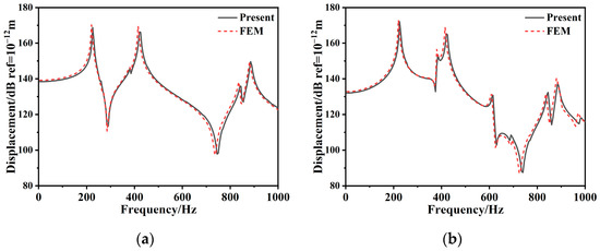 Rikards [27] explored the free vibration of the composite stiffened plate with a central stiffener under fully clamped boundary conditions. The dimensions are a = 0.25 m, b = 0.5 m, hp = 0.00104 m, hs = 0.0105 m, and bs = 0.00364 m. The central stiffener, positioned at x = 1/2 a, is parallel to the y-axis. The material parameters are E1 = 128 GPa, E2 = 11 GPa, G12 = 4.48 GPa, G13 = 4.48 GPa, G23 = 1.53 GPa, μ12 = 0.25, and ρ = 1500 kg/m3. The ply schemes for the laminate panel and laminate stiffener are [0/ ± 45/90]s and [07/907]s, respectively. Each ply thickness is 0.13 mm. The FEM model of the composite stiffened plate is established using Patran. For the finite element analysis (FEA) of the composite stiffened plate, the upper frequency limit is set at 1000 Hz. Based on the bending wavelength formulation, the maximum element size should not exceed 0.02 m. Both the laminate panel and the laminate stiffener are modeled using shell elements, with a maximum element size of 0.0125 m, and the number of total meshes is 840. Nastran is used to analyze the composite stiffened plate free and forced vibration characteristics. Table 3 presents the first five natural frequencies of the composite stiffened plate. The average difference between the theoretical results and the FEM results is 2.15% and the maximum error does not exceed 5%. Figure 5 shows the composite stiffened plate vibration displacement response subjected to single-point excitation. The excitation position is (a/2, b/2) and the excitation amplitude is 1 N. It can be found that the theoretical results and the FEM results of displacement response are in good agreement.