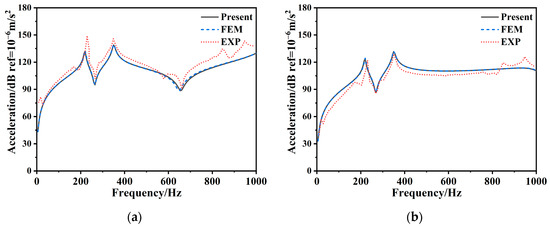 GAO [25] conducted an experimental study on the steel stiffened plate free and forced vibration. The dimensions of the steel stiffened plate are a = 0.5 m, b = 0.5 m, hp = 0.008 m, hs = 0.01 m, and bs = 0.01 m. The stiffeners are arranged at x = 1/4 a and x = 3/4 a, parallel to the y-axis. The material parameters are E = 210 GPa, μ = 0.3, and ρ = 7800 kg/m3. The boundary condition is FCFC, i.e., x = 0 and x = a are the free boundaries, and y = 0 and y = b are the clamped support boundaries. Patran is used to create the FEM model for the steel stiffened plate. The calculation upper frequency is 1000 Hz. According to the bending wavelength formulation, the maximum element size must not exceed 0.046 m. The panel and stiffeners are modeled using shell elements and beam elements, respectively, with a maximum element size of 0.0125 m. The total number of shell elements is 1600, and there are 80 beam elements. Nastran is employed to analyze the steel stiffened plate vibration characteristics. GAO [25] performed a modal experiment using the multi-point excitation and single-point pickup techniques. Both sides of the steel stiffened plate are fixed to simulate the clamped boundary conditions. An acceleration sensor is arranged at the center of the steel stiffened plate. A force hammer is used to knock the excitation points one by one, and the natural frequencies and the mode shapes are obtained through frequency analysis. Furthermore, GAO also conducted a forced vibration experiment of the steel stiffened plate under single-point excitation. A vibration exciter, which induces a linear sweep excitation at an amplitude of 1 N, is positioned beneath the center of the stiffened plate and is connected to the stiffened plate through a force sensor. The force sensor is used to record the excitation information from the vibration exciter. Acceleration sensors, arranged at the excitation point (a/2, b/2) and the observation point (a/2, b/5), are used to measure the vibration acceleration response through the data acquisition system post-processing. Figure 6 shows the experiment arrangements of the vibration exciter and sensors on the steel stiffened plate. Table 4 displays the first three modes of the theoretical, FEM, and experimental results and shows that the mode shapes are consistent. The maximum discrepancy between the theoretical and experimental results is less than 5%. Figure 7 illustrates the steel stiffened plate vibration acceleration levels of the excitation and observation points. From Figure 7, it is obvious that the theoretical curves are in good agreement with the FEM curves. Both theoretical and experimental curves show similar trends, with relatively minor deviations at single peaks. It demonstrates that the theoretical method presented in this paper effectively analyzes the stiffened plate free and forced vibration.