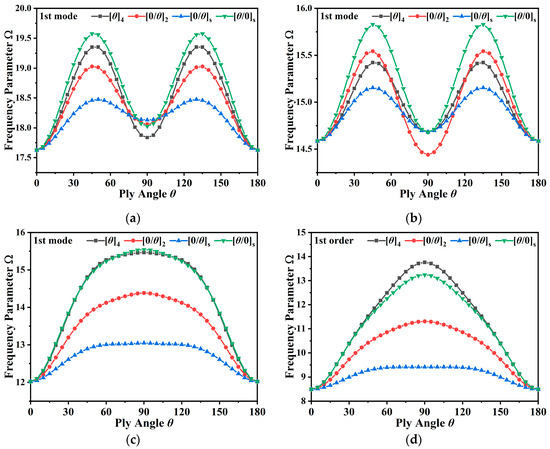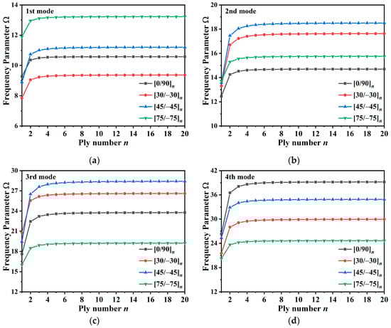 The frequency parameter of the composite stiffened plate with different ply numbers: (a) 1st mode; (b) 2nd mode; (c) 3rd mode; (d) 4th mode.