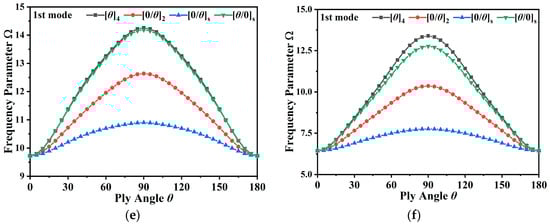 The fundamental frequency parameter of the composite stiffened plate with different ply schemes and ply angles: (a) a = b, hp = 0.005 b; (b) a = b, hp = 0.01 b; (c) a = 1.5 b, hp = 0.005 b; (d) a = 1.5 b, hp = 0.01 b; (e) a = 2 b, hp = 0.005 b; (f) a = 2 b, hp = 0.01 b.