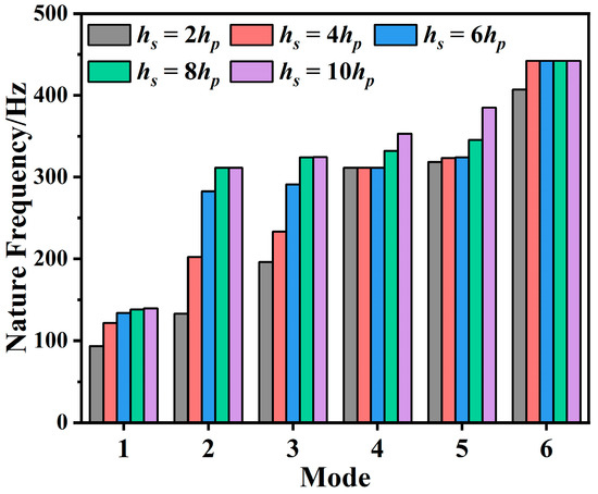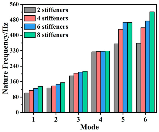 Stiffener structural parameters are crucial for the design of stiffened plate vibrations. Figure 10 shows the natural frequency variation in the composite stiffened plate with different stiffener heights. The dimensions are b = 0.5 m, a = 2 b, hp = 0.01 b, bs = 0.01 b, and hs/hp = 2, 4, 6, 8, 10. The ply schemes of the laminate panel and laminate stiffener are [0/90]10 and [0]10. According to Figure 10, the natural frequency of the composite stiffened plate increases as the stiffener height increases. Figure 11 investigates the influences of stiffener space on the natural frequency of the composite stiffened plate. The dimensions are b = 0.5 m, a = 2b, hp = 0.01 b, hs = 2 hp, and bs = 0.01 b. The stiffener space c is 0.3 m, 0.4 m, 0.5 m, and 0.6 m. As depicted in Figure 11, the fundamental frequency of the composite stiffened plate decreases as the stiffener space increases. Figure 12 explores the impact of the stiffener numbers on the composite stiffened plate natural frequency. The number of stiffeners is 2, 4, 6, and 8. The results, as shown in Figure 12, indicate that the frequency parameter increases with the stiffener numbers.