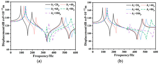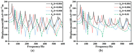 Composite stiffened plate displacement response with different stiffener heights: (a) excitation point (a/2, b/2); (b) observation point (a/2, b/4).