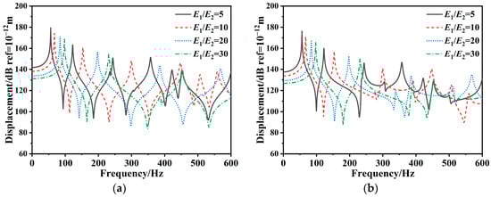 Figure 14 illustrates the displacement response of the composite stiffened plate with different anisotropic ratios. The dimensions are b = 0.5 m, a = 2 b, hp = 0.01 b, hs = 0.01 b, and bs = 0.01 b. The material and ply scheme parameters are consistent with Table 6. According to Figure 14, as the anisotropic ratio increases, the resonance peak of the displacement response shifts to a higher frequency, and its amplitude decreases. It is attributed to the improved structural stiffness of the composite stiffened plate, which leads to an increase in the natural frequency.