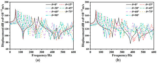 Composite stiffened plate displacement response with various ply angles: (a) excitation point (a/2, b/2); (b) observation point (a/2, b/4).