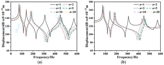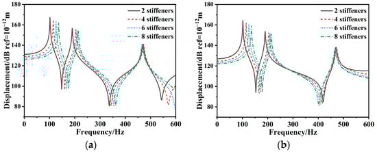 Composite stiffened plate displacement response with various numbers of stiffeners: (a) excitation point (a/2, b/2); (b) observation point (a/2, b/4).