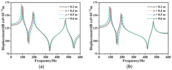 Composite stiffened plate displacement response with different stiffener spaces: (a) excitation point (a/2, b/2); (b) observation point (a/2, b/4).