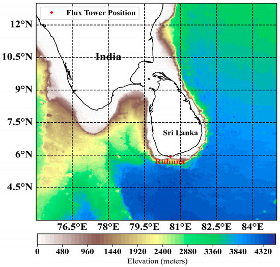 This study also referred to the Sri Lankan flux tower observation data provided by the China-Sri Lanka Joint Center for Education & Research of the Chinese Academy of Sciences (CAS). The observatory is located at Ruhuna in the southern part of Sri Lanka, with specific coordinates of 80.5779° E and 5.9357° N, at approximately 10 m above sea level. The data were collected from 10 April 2017 to 3 September 2018 as hourly updated WS and direction data, which provided valuable ground-truth measurements to validate and calibrate the remotely sensed and reanalyzed information for this study.