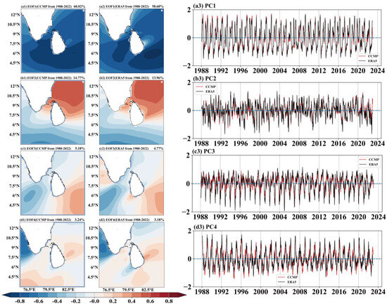 The EOF Distribution from 1988 to 2022: (a1–d1): the first four modal spatial distributions of CCMP; (a2–d2): the first four modal spatial distributions of ERA5; (a3–d3): the monthly averaged time series plots of ERA5 and CCMP data, the red line represents CCMP data, and the black line represents ERA5 data.