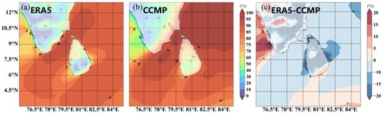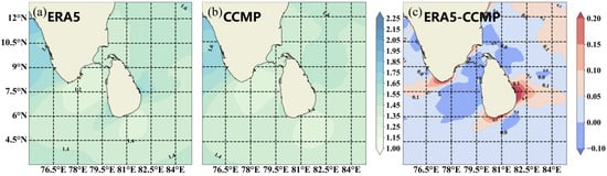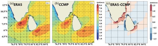 Spatial distribution of annual mean wind speed and direction during 1988–2022, (a) ERA5, (b) CCMP, and (c) The difference between ERA5 data and CCMP data. ).