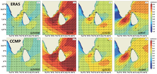 Spatial distribution of seasonal mean wind speed and direction during 1988−2022. MAM is March to May, JJA is June to August, SOD is September to November, DJF is December to February of the following year. (a–d) are ERA5 data. (e–h) are CCMP data.