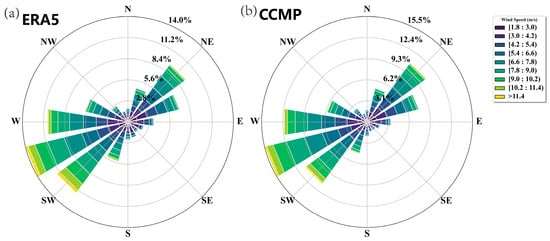 In the ERA5 data, Figure 6a illustrates the annual average wind direction and wind frequency distribution. It is evident that the primary wind direction in the study area is WSW and neighboring directions, followed by the NE and several adjacent directions, forming a cluster distribution. The maximum WS is observed in WSW, constituting approximately 14.0%, followed by SW and W, with wind frequencies of around 11.3% and 11.0%, respectively. Conversely, in Figure 6b, CCMP displays similar wind directions, yet NE and surrounding directions represent a larger proportion compared to ERA5.
