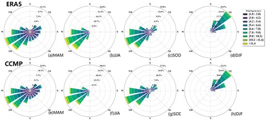 Wind rose diagram of seasonal distribution of wind speed during 1988−2022. (a) MAM, (b) JJA, (c) SOD, and (d) DJF are ERA5 data. (e) MAM, (f) JJA, (g) SOD, and (h) DJF are CCMP data.