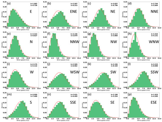 Weibull probability distribution in all directions from 1988 to 2022. (a) E: East, (b) ENE: East-Northeast, (c) NE: Northeast, (d) NNE: North-Northeast, (e) N: North, (f) NNW: North-Northwest, (g) NW: Northwest, (h) WNW: West-Northwest, (i) W: West, (j) WSW: West-Southwest, (k) SW: Southwest, (l) SSW: South-Southwest, (m) S: South, (n) SSE: South-Southeast, (o) SE: Southeast, (p) ESE: East-Southeast. x-axis: wind speed; y-axis: probability density function (PDF). Red line: Weibull distribution of wind speed probability; λ: scale parameter; k: shape parameter.