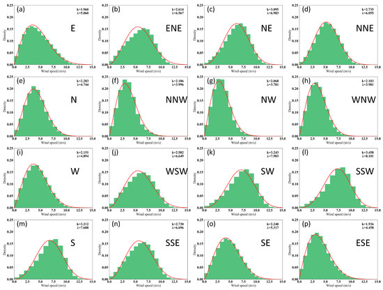 Weibull probability distribution in all directions from 1988 to 2022. (a) E: East, (b) ENE, (c) NE, (d) NNE, (e) N, (f) NNW, (g) NW, (h) WNW, (i) W, (j) WSW, (k) SW, (l) SSW, (m) S: South, (n) SSE, (o) SE, (p) ESE. x-axis: wind speed; y-axis: probability density function (PDF). Red line: Weibull distribution of wind speed probability; λ: scale parameter; k: shape parameter.