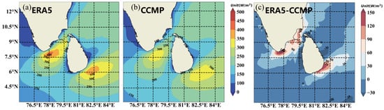 Spatial distribution of annual mean WPD (wind power density) during 1988−2022, (a) ERA5, (b) CCMP, and (c) The difference between ERA5 data and CCMP data. ().