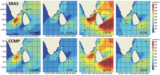 Spatial distribution of seasonal mean WPD (wind power density) during 1988−2022. (a) MAM, (b) JJA, (c) SOD, and (d) DJF are ERA5 data. (e) MAM, (f) JJA, (g) SOD, and (h) DJF are CCMP data.