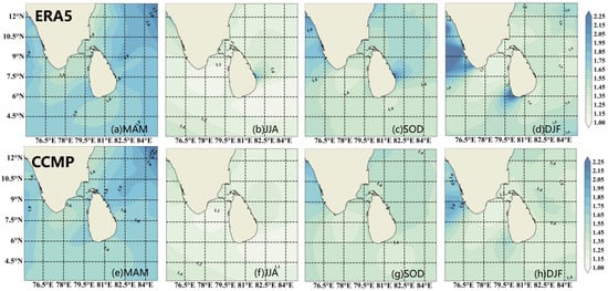 The Indian Ocean, due to its unique geographical location, is significantly influenced by monsoon winds throughout the year, resulting in large variations in WS in different seasons. In order to understand the impact of such seasonal variations on the WERs in the sea off Sri Lanka, the present study plots the seasonal annual mean WS and analyzes the variation of WS in the four seasons of MAM (March, April, and May), JJA (June, July, and August), SON (September, October, and November), and DJF (December, January and February of the following year) [35].