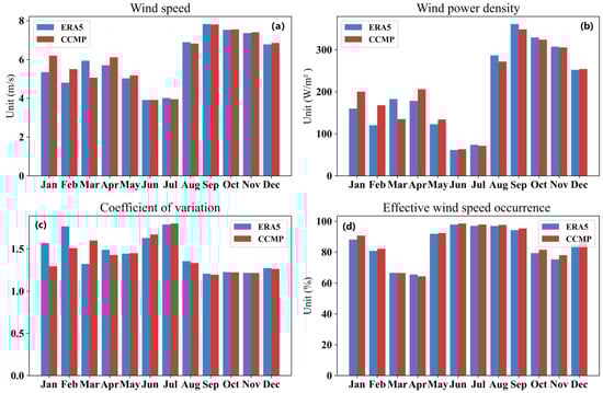 Monthly distribution of changes from 1988 to 2022: (a) Monthly variation of average WS; (b) Monthly variation of average WPD; (c) Monthly variation of coefficient of variation; (d) Monthly variation of EWSO. Blue represents ERA5 data, while red represents CCMP data.