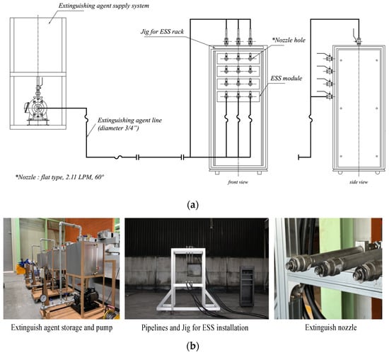 A fire extinguishing system to spray water-based extinguishing agents for marine ESS fire suppression was constructed as shown in Figure 1a. This comprehensive system comprises essential equipment for the effective distribution of water-based extinguishing agents, including a high-capacity pump, an extinguishing agent tank constructed from corrosion-resistant stainless steel with a substantial volume of 125 L, a network of flexible pressure hoses utilized as pipelines to transport the extinguishing agents, and specialized full-cone nozzles manufactured from durable stainless steel 304. Notably, the pump is equipped with a pump-up head of 52 m or higher, ensuring sufficient pressure to facilitate the effective dispersion of the extinguishing agents across the targeted area. The stainless steel composition of the extinguishing agent tank serves as a protective measure against corrosion, safeguarding the integrity and longevity of the tank. The flexible pressure hoses employed as pipelines offer versatility and ease of installation, enabling seamless transport of the extinguishing agents to the desired locations within the ESS environment. Moreover, the full-cone nozzles are meticulously designed with a flow rate of 3.2 LPM, an operating pressure of 5 bars, and an injection angle of 60°, facilitating optimal coverage and dispersion of the extinguishing agents. Figure 1b shows the components of the fire extinguishing system.