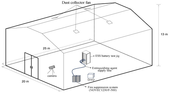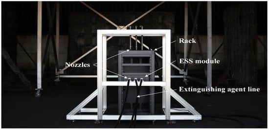 The investigation into the efficacy of a fire extinguishing system in mitigating thermal runaway events within an ESS was conducted within the confines of a fire test building measuring 20 m × 25 m × 13 m, outfitted with dust collector fans and fire insulation, thereby simulating realistic fire scenarios. Thermal runaway incidents were deliberately induced in both a unit module and multiple modules, following the standardized procedures delineated in UL 9540A [21]. The primary objective of this study was to evaluate the suppression performance of the fire extinguishing system under these controlled yet representative conditions. Upon positioning the ESS rack centrally within the fire test building, meticulous precautions were taken to ensure the safety and integrity of the experimental setup. The fire extinguishing system, comprising essential components such as the extinguishing agent tank, pump, pipelines, and extinguishing nozzles, was seamlessly integrated with the ESS rack via interconnected pipelines. To mitigate any potential risks associated with the operation of the extinguishing system, strategic placement of the extinguishing agent tank and pump at a safe distance from the rack was implemented, complemented by the installation of protective panels to fortify their structural resilience against potential fire-related hazards.