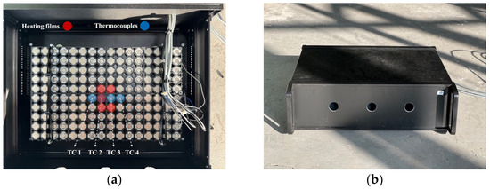 Prior to the experimental phase, preprocessing of the ESS module was conducted, involving two cycles of charging and discharging to ensure uniformity and stability. The module’s state of charge was maintained at 100% and stabilized for one hour preceding the experiment to establish baseline conditions. Thermal runaway was initiated within the ESS module by affixing a heating film measuring 20 cm × 5 cm to five individual cells at the module’s center; activation of the heating film was performed with 12 volts and 10 watts power output. Temperature changes resulting from thermal runaway were monitored using K-type thermocouples installed on both the single cells and adjacent cells within the module as illustrated in Figure 3a.