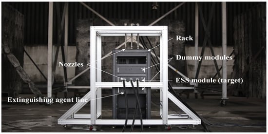 The multi-module fire suppression test was conducted to assess the impact of the process of suppressing the fire generated in the unit module on adjacent modules by installing dummy modules above and below a unit module. The dummy modules were installed to assess the impact on adjacent modules during the suppression process of a fire originating in the unit module (target module). For the test, one unit module and dummy modules were installed in the ESS rack as shown in Figure 5. Extinguishing nozzles, which are the components of the fire extinguishing system, were installed in the three holes in the front part of the unit module and on top of the rack. The thermal runaway of unit cells was caused by heating the five cells at the center of the unit module using a heating film. Four K-type thermocouples were installed at the cells that caused thermal runaway and adjacent cells to measure the thermal runaway of the unit cells and the temperature change inside the module during the fire suppression process. The temperature was measured in real time. Thermal runaway was induced by heating the internal cells of the unit module using the heating film installed inside the cells. The operation of the heating film was stopped at the time of the off-gas eruption and flames from the cells inside the module, and the extinguishing agent was released for approximately 10 s by operating the fire extinguishing system. The temperature was monitored for more than 300 s to verify re-ignition after spraying the extinguishing agent. Two types of extinguishing agents for ESS fires (Novec 1230 and F-500) were used, and their fire suppression effects were examined.