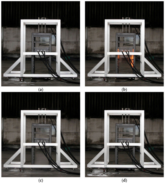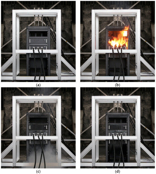 Following the application of the extinguishing agent, continuous monitoring of temperature dynamics within the modules is conducted to assess the effectiveness of fire suppression and detect any signs of re-ignition. This post-suppression monitoring phase is essential for verifying the system’s ability to maintain fire control over an extended period. The test was completed when no temperature rise was observed. Figure 9d shows the completion of the test.