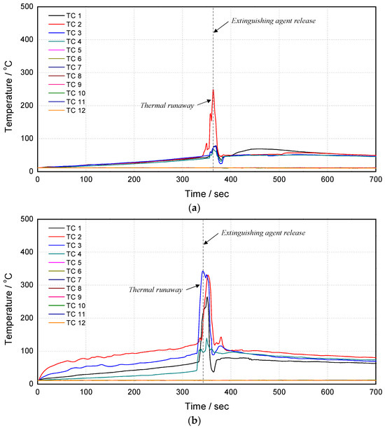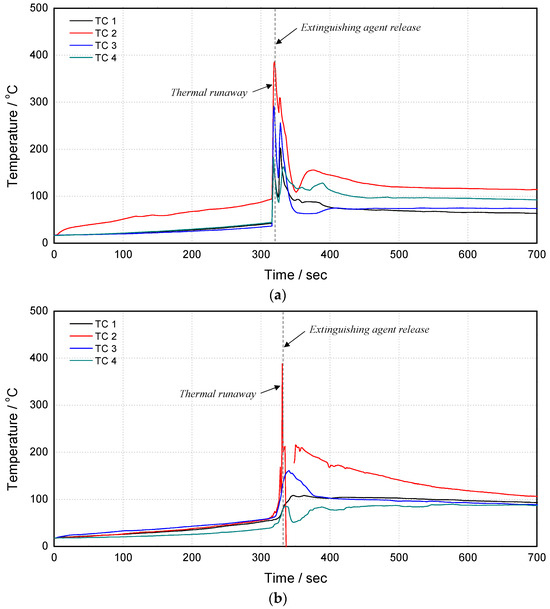 Figure 10b shows the multi-module fire suppression test results when F-500 is used as the extinguishing agent. The temperature change in the cells inside the modules over time can be observed. K-type thermocouples inside the modules were installed similarly to the aforementioned fire suppression test that used Novec 1230. As shown in Figure 10b, the thermal runaway caused by cell heating occurred at 334 s after the start of the test at a temperature of 342.7 °C at TC 3. Following the occurrence of thermal runaway, the extinguishing agent was sprayed immediately and the temperature inside the module rapidly decreased. For TC 2, a temperature rise of 17.3 °C was observed for approximately 3 s at 377 s after the temperature drop. However, the temperature gradually decreased, subsequently, with no special event or re-ignition as in the case of Novec 1230. The heat transfer to the adjacent dummy modules caused by the thermal runaway of the target module was not observed as indicated by the temperature change in TC 5 to 12 in Figure 10b. The fire suppression results for the ESS multiple modules by the fire extinguishing system showed that fire propagation to the adjacent modules could be prevented because the system enabled the initial suppression of the target module in which thermal runaway occurred.