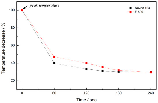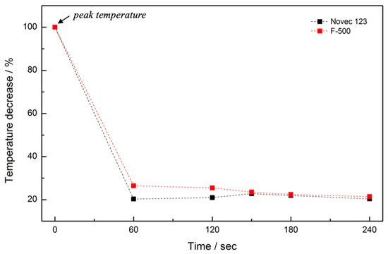 Figure 11 shows a comparison of the temperature drop effect of the Novec 1230 and F-500 extinguishing agents on TC 2 of the multi-module system. As in the case of the single module, the rate of temperature drop in TC 2 was calculated. The initial temperature drop for Novec 1230 was slightly higher than for F-500, and the ratio of the temperature drop was almost the same 150 s after the extinguishing agent was released. In both the single and multi-module cases, the temperature drop of the initial temperature was higher for Novec 1230.