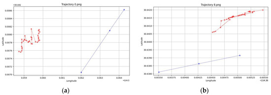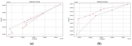 In this group, we considered scenarios in which target vessels encounter each other in both radar image and AIS data. An encounter refers to a situation in which vessels approach each other in close proximity or along intersecting paths. Specifically, we selected two typical situations within this group for analysis. We extracted and processed the data to obtain a total number of 77 trajectory samples for further analysis. In such cases, the trajectories of the target vessels may exhibit significant differences in terms of distance and heading, as illustrated by the trajectories of vessels 1960 and 1981 in Figure 9a and target 1751 and target 1782 in Figure 9b. This experiment was designed to evaluate the performance of our method in situations involving vessel encounters.
