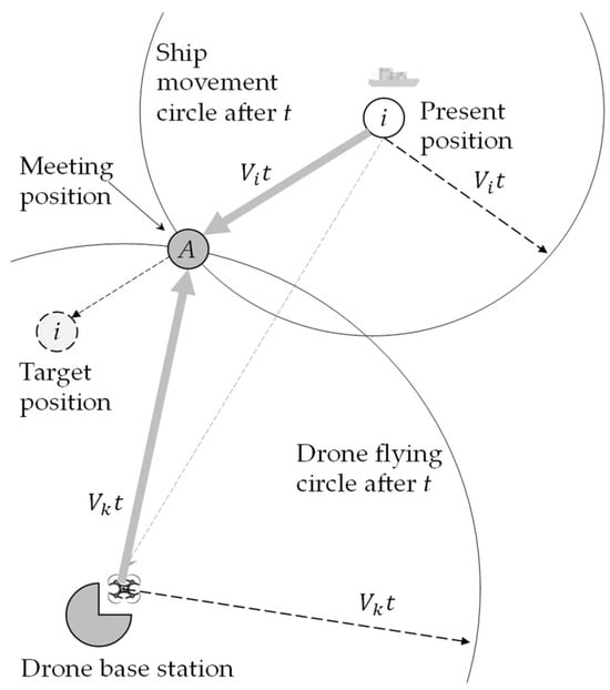 For a ship situated at coordinates , its movement is directed toward a target location at a speed . Meanwhile, a drone base station k is positioned at . If station k deploys a drone at speed to approach ship , the drone must travel for a duration to intersect with the moving ship at its target trajectory.