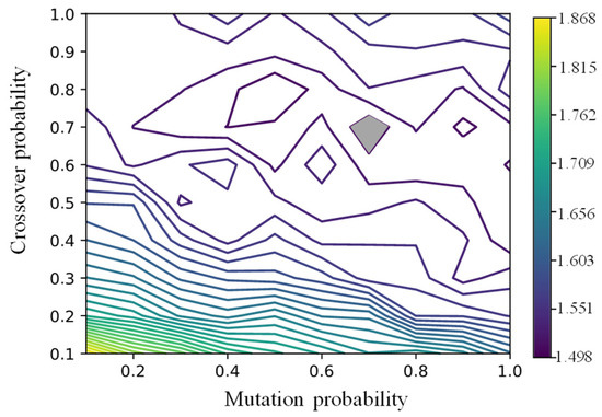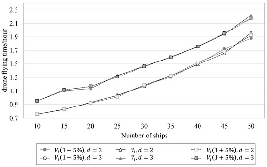 Table 6 presents the sensitivity of the ships’ speeds () by varying them −5% and 5% and the sensitivity of the drones’ speeds () by varying them −5% and 5%. From the information in Table 6, we can see that the increase or decrease in the shipping speed does not show an apparent correlation regularity on the effect of the objective function, while the rise in the drone flight speed can effectively decrease the value of the objective function; the decline in the drone flight speed will make the value of the objective function grow larger. As presented in Figure 7, improving the flight speed of drones is probably more effective for optimizing the detection time of multi-drone ship pollution emissions.