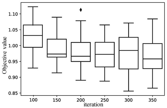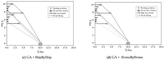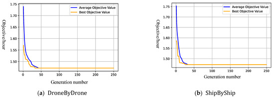 In Figure 5a, the ships are presumed to be stationary, not moving, and just waiting for emission detection. Therefore, the meeting positions are still located at . In Figure 6b, the bi-stage SIH is used. In the first stage, the ships are presumed to be stationary, and the baseline model is used to obtain the assignments of ships to the two drones and the sequence of ships for each drone. So, in Figure 5b, the assignments and sequences of ships to each drone are the same as in Figure 5a. However, the second stage algorithm [SIH] changes the meeting positions and times. In Figure 5b, the movements of ships can be observed. In Figure 5c,d, the and -based GAs are executed to generate demonstrative results. In these two figures, we can observe no differences. However, when the algorithms are repeated 50 times, the average objectives will incur minor differences, as presented in Table 5. The two decoding strategies will also incur discrepancies in convergence speeds and quality, as shown in Figure 6. The strategy can achieve better solutions while lowering convergency performance more than the .