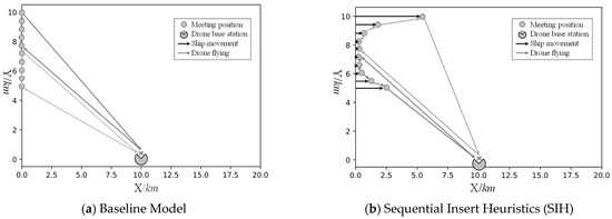 About the VRP, we have formulated the baseline model to determine the sequence in which a drone visits ships, assuming that the ships are stationary and awaiting detection. This model is then expanded, considering the simultaneous movements of both drones and ships. Subsequently, a two-stage algorithm is developed for this purpose. The first stage involves deriving an initial solution by solving the baseline model, which does not consider the concurrent movements of drones and ships. The second stage employs Sequential Insert Heuristics—Algorithm 1 (SIH)—to translate the ship sequences from the initial solution into actual drone routes, this time factoring in the simultaneous movements of the drones and ships.